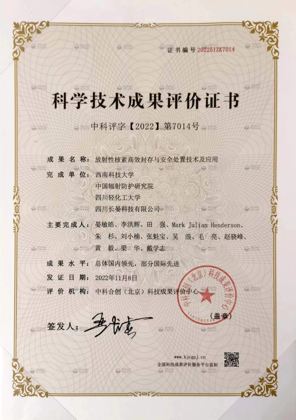 專家評審后認為,該項目技術總體達到國內領先水平,其中在放射性核素的固化工藝技術方面達到國際先進水平。與會專家一致同意,“放射性核素高效封存與安全處置技術及應用”項目通過科技成果評價。